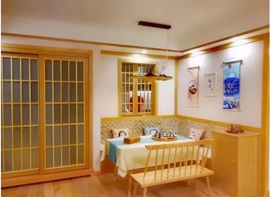 【餐厅】餐厅利用转角空间设计了L型卡座,不仅能很好地节省空间,还能够增加存储空间,非常实用。墙面上特意选择了和风挂画,搭配一幅毛笔字写的“饭堂”装饰,具有很好的效果。